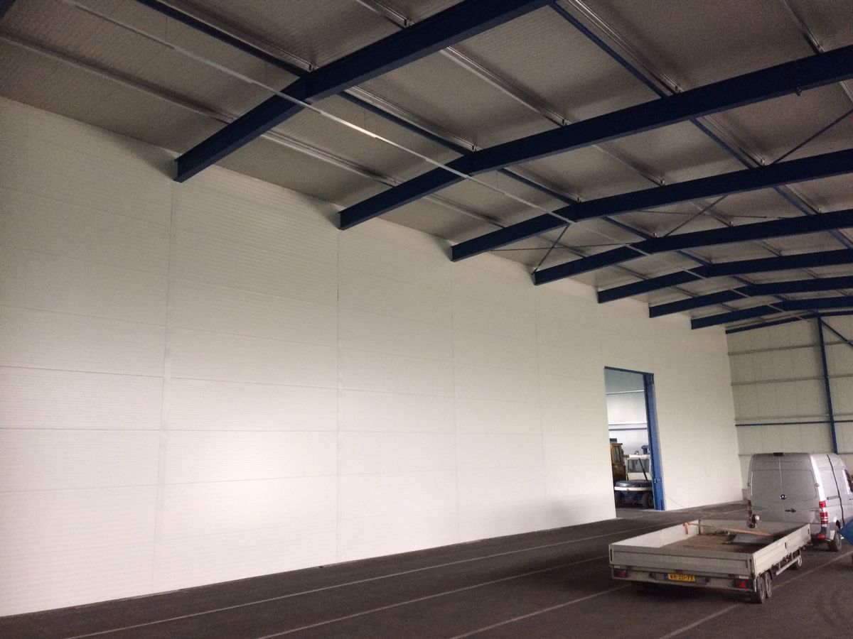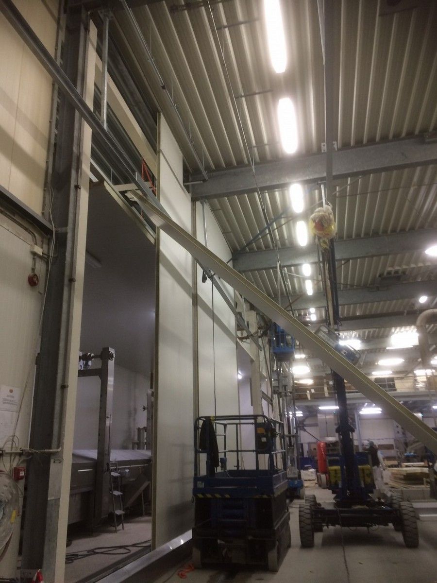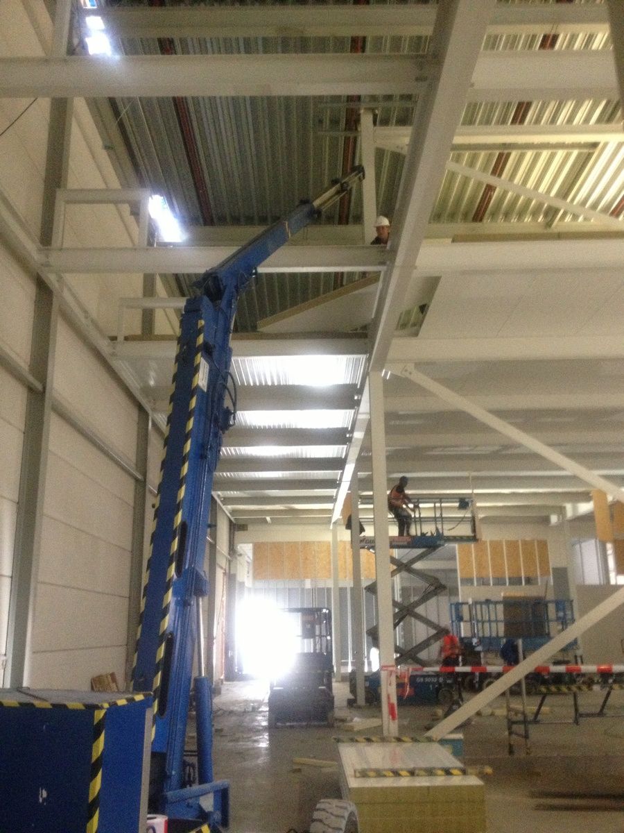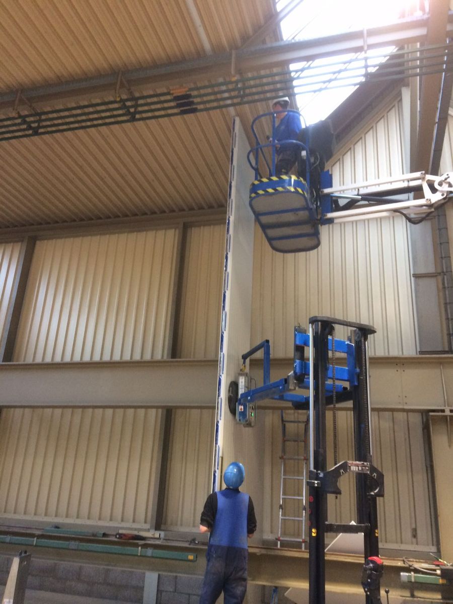Voor de montage van langere of zware steenwol binnenwanden maken wij veelal gebruik van onze electro/hydraulische montagekraan welke op afstand bestuurbaar is en geluidsarm is.